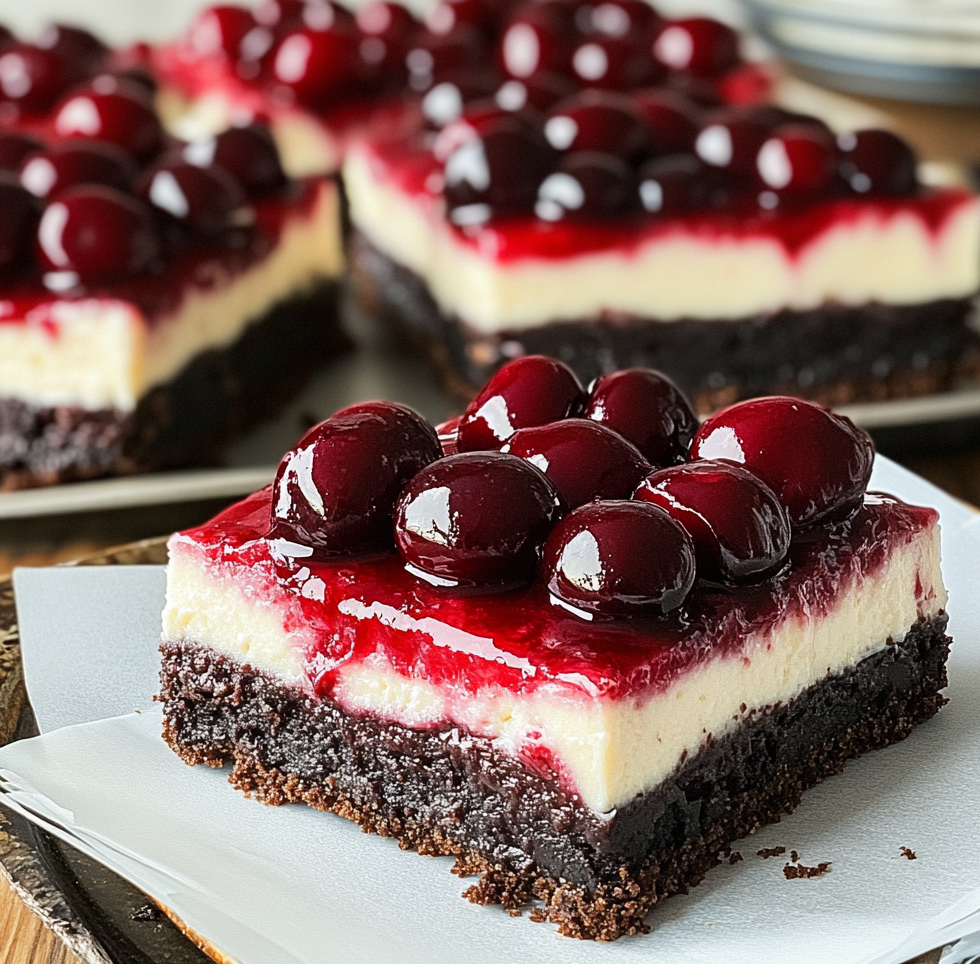 These bars feature a chocolate cookie crust, creamy vanilla cheesecake filling, and sweet cherry topping, combining classic flavors into a portable dessert.