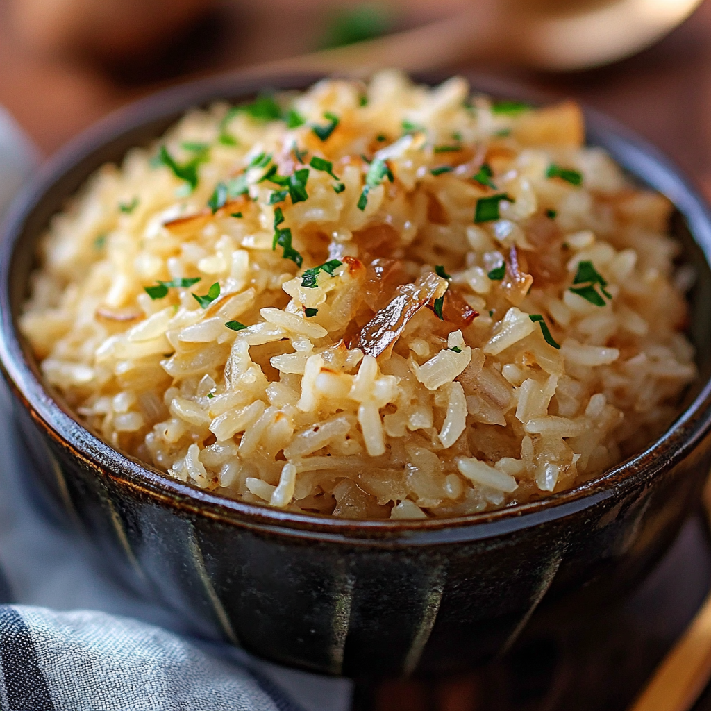 French Onion Butter Rice is a savory side dish that combines sweet caramelized onion flavors with buttery, rich rice, inspired by classic French onion soup.
