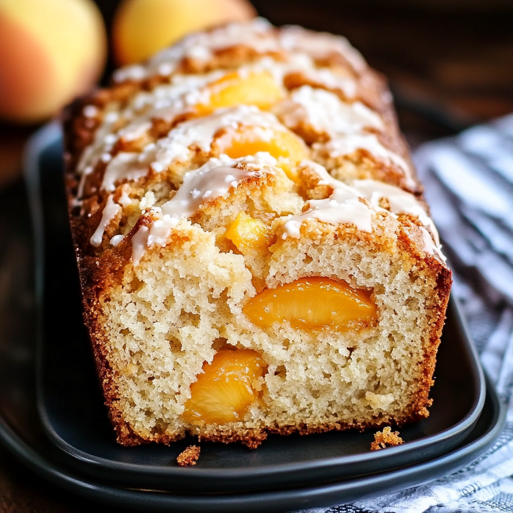 The combination of fresh peaches and a rich glaze gives this bread its unique flavor and moist texture, perfect for summer gatherings.