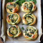 Spinach Artichoke Swirls are delicious pastries filled with a creamy mixture of spinach and artichokes wrapped in flaky puff pastry. They make great appetizers or snacks.